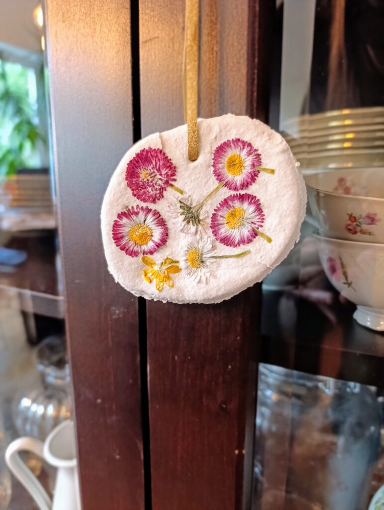Die Salzteiganhänger mit getrockneten Blumen sehen besonders schön aus, wenn du sie ans Fenster hängst – das Licht bringt die zarten Farben der Blumen zum Leuchten. Du kannst sie aber auch als Geschenkanhänger, Wanddekoration oder sogar als Tischdeko für eine Sommerparty verwenden.